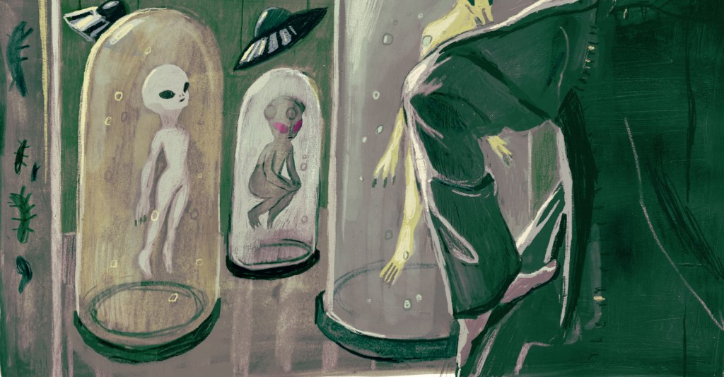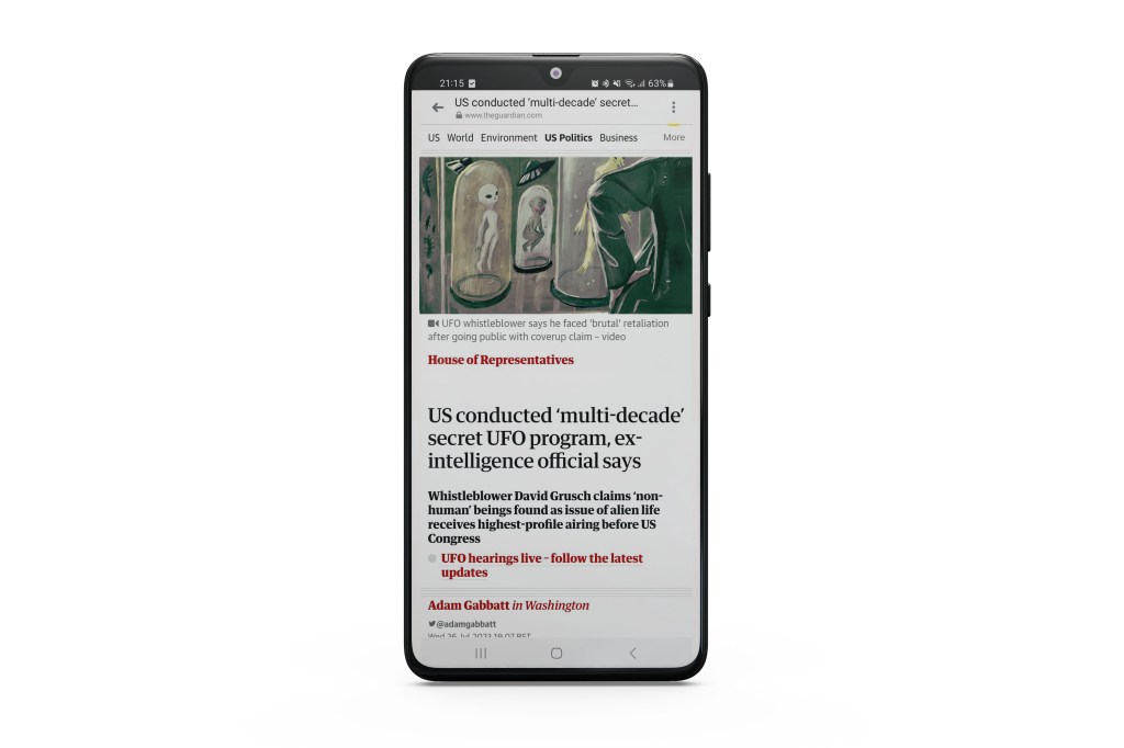 A series of speculative illustrations for The Guardian article titled, ‘US conducted ‘multi-decade’ secret UFO program, ex-intelligence official says’