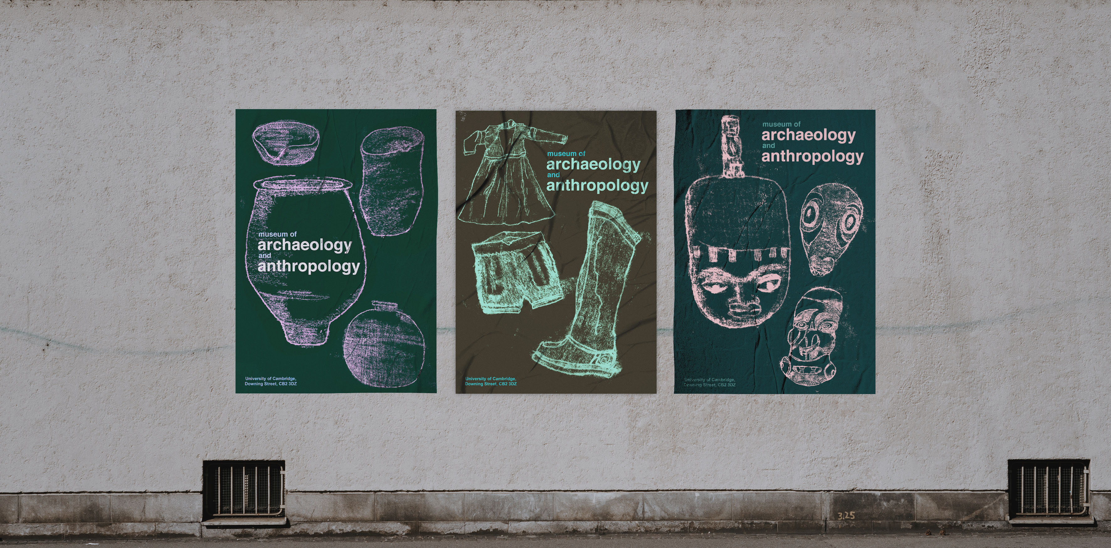 These poster designs reflect three different types of objects found at the museum: masks, pots, and clothing.